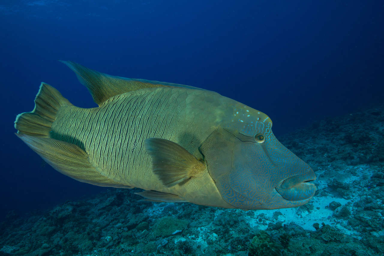 Sometimes referred to as “elephants of the coral reef,” adult wrasse inhabit a reef's outer slopes and steep drop-offs, showing fidelity toward particular sites. Juveniles are usually found among thickets of living staghorn corals.